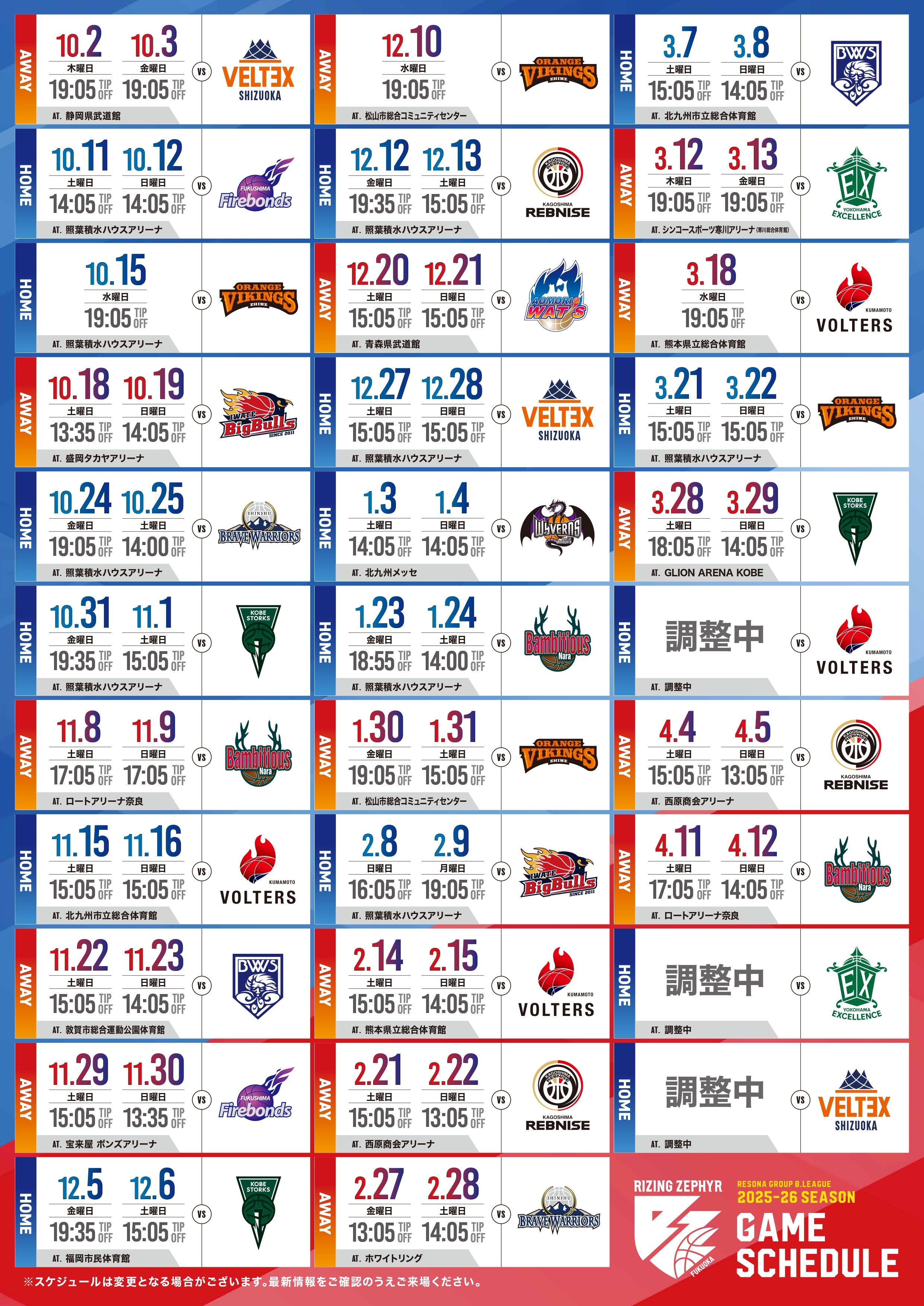 ※12/2:第22節(2/27 信州ブレイブウォリアーズ戦)の試合時間を更新しました