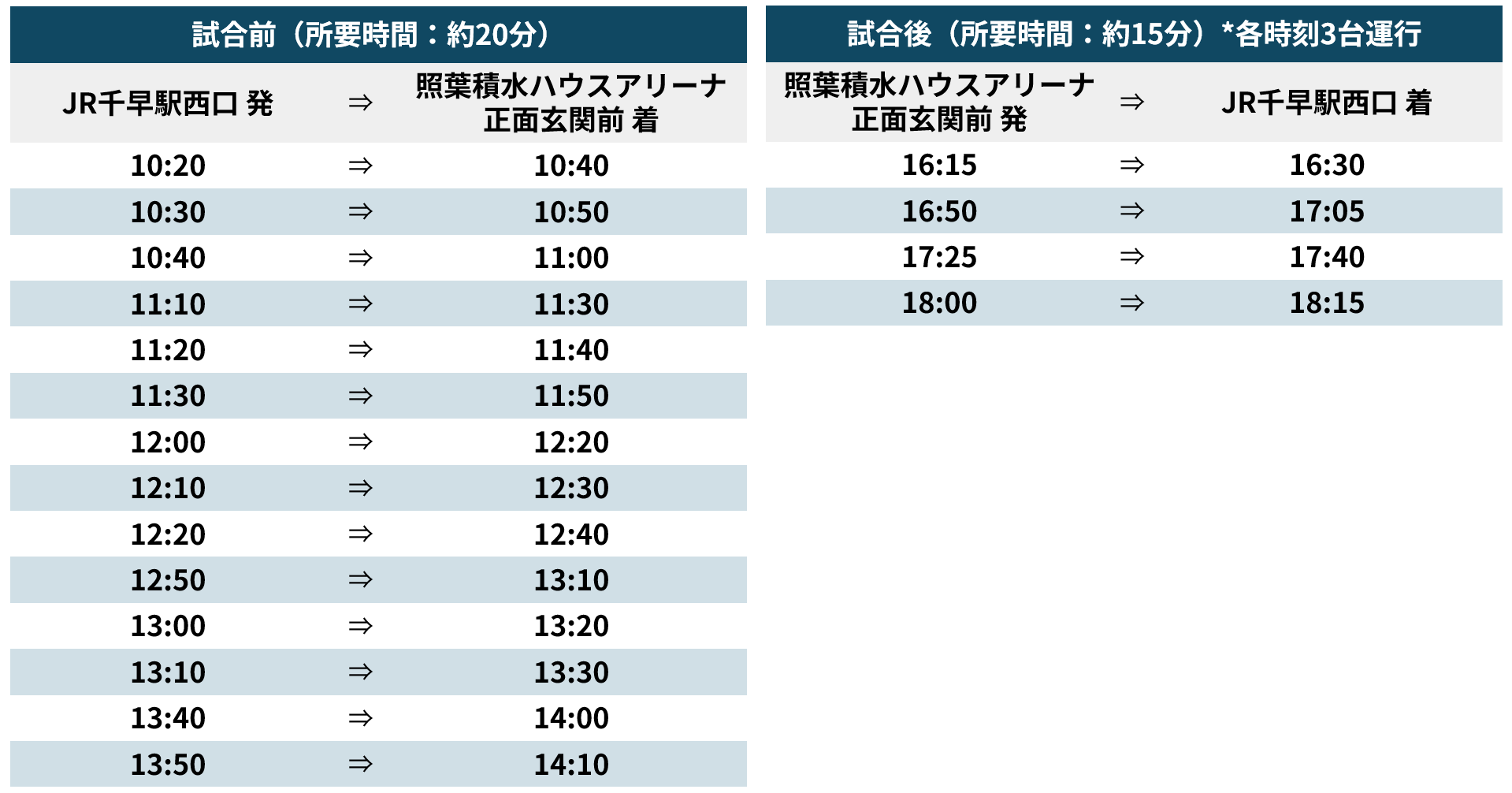 また、公共交通機関をご利用いただく方の利便性向上のため、JR千早駅と照葉積水ハウスアリーナを結ぶ【シャトルバス】を運行いたします。ぜひご利用ください。