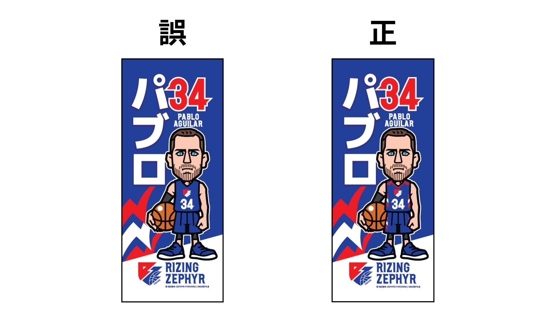 この度、ライジングゼファーフクオカ公式グッズ「選手イラストタオル(#34 パブロ・アギラール選手)」において、イラストのユニフォーム部分にデザインの不備があることが判明いたしました。