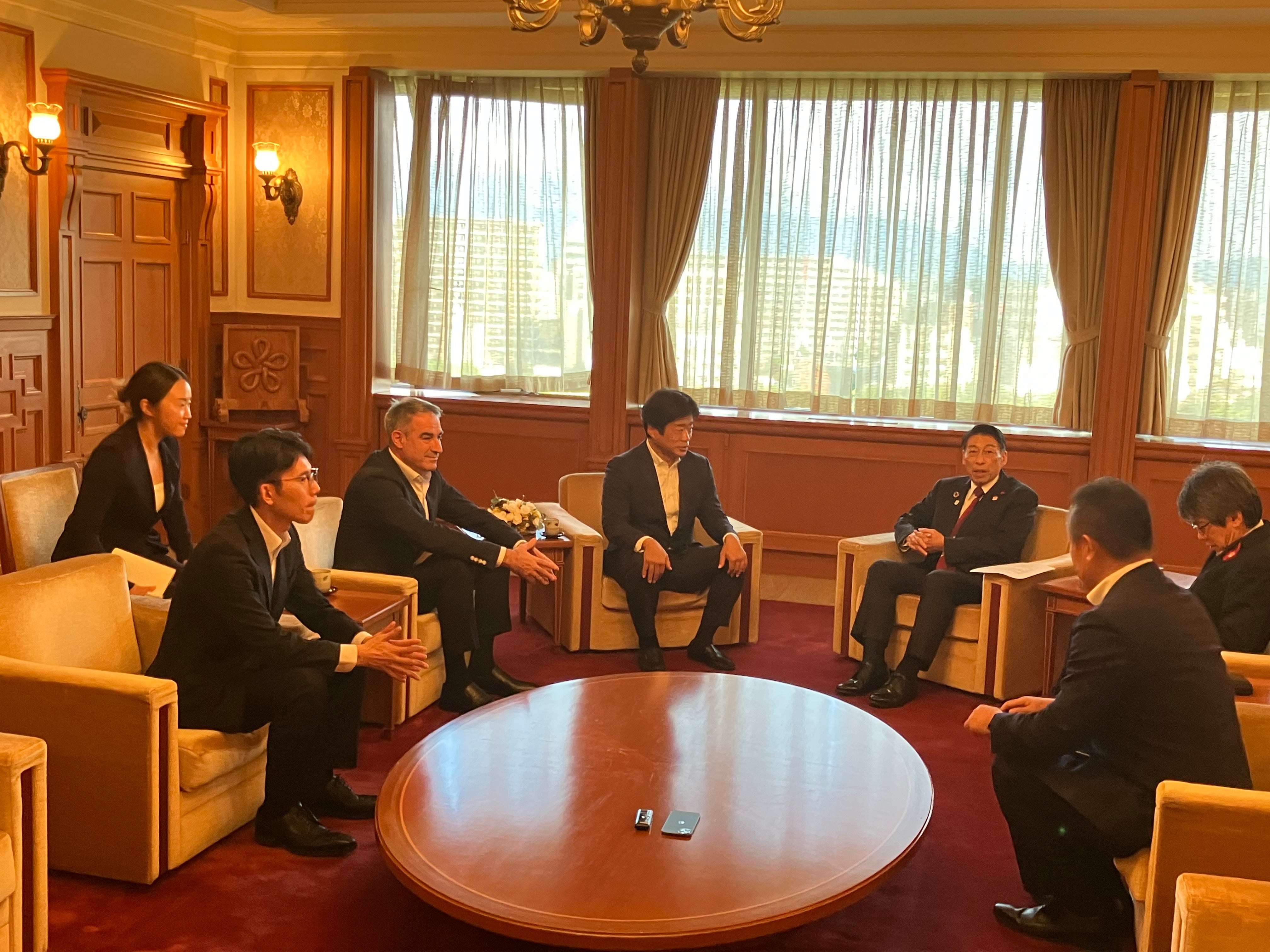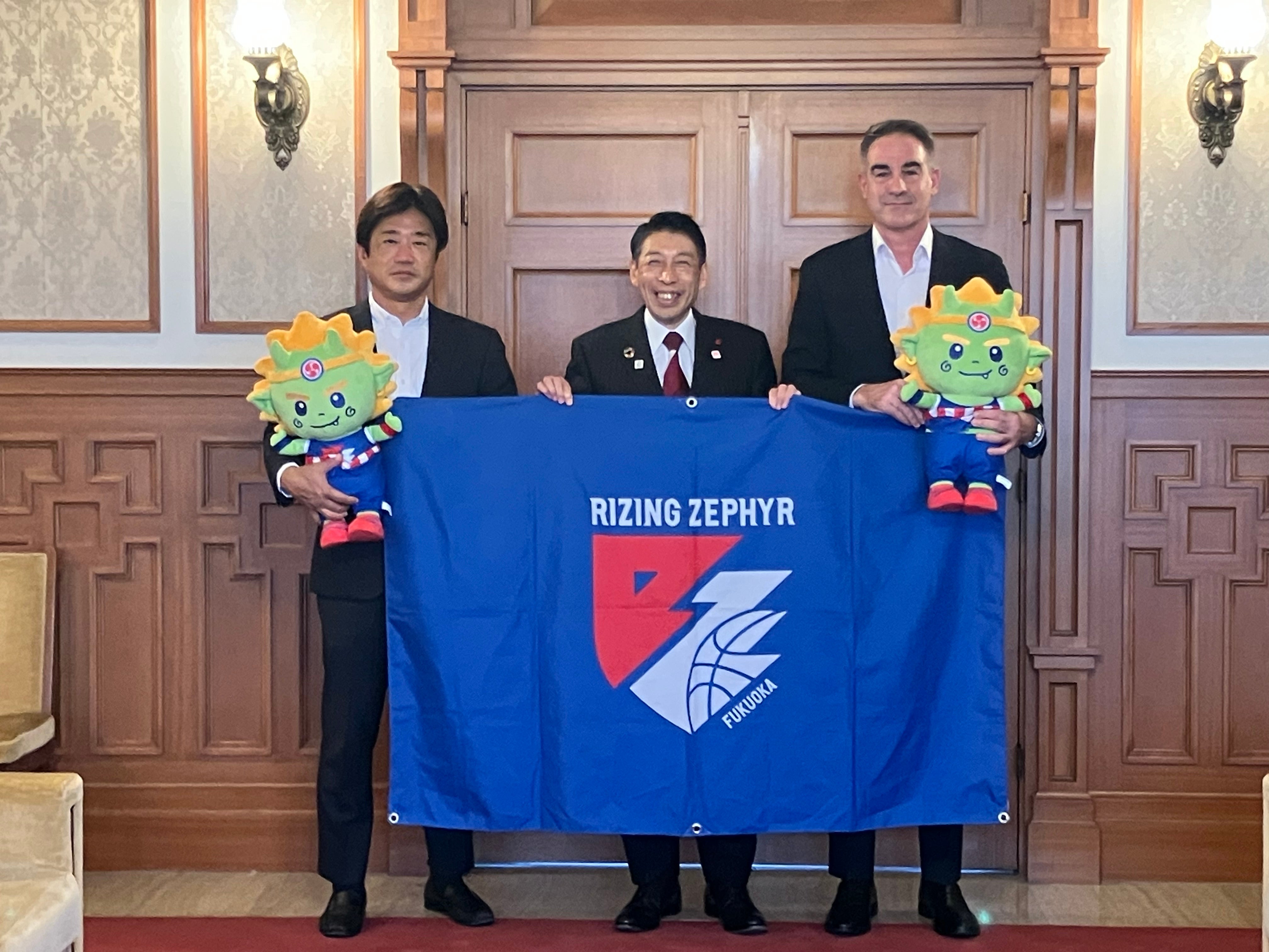 本日(10/23)、ライジングゼファーフクオカ 代表取締役社長 古川宏一郎とゼネラルマネージャー コスタンティノス・コーチスが服部誠太郎福岡県知事を表敬訪問しました。