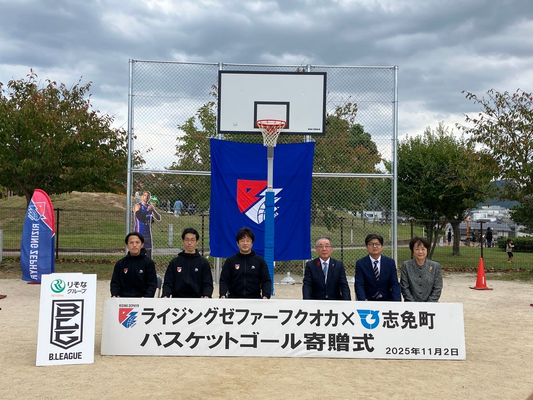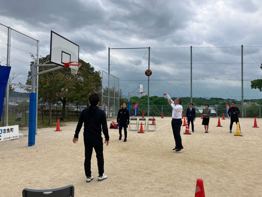 11月2日(土)、フレンドリータウン協定を締結している志免町のシーメイト多目的広場にて、バスケットゴール2基の寄贈式を執り行いました。