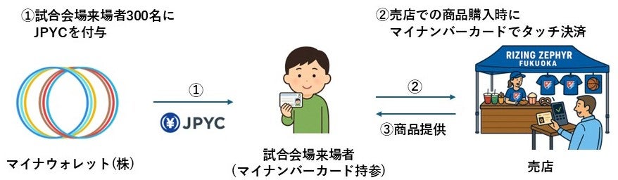 | 実施内容 | ライジングゼファーフクオカの試合会場来場者のマイナンバーカードに、1,000円相当の日本円建ステーブルコイン(JPYC)を付与します。 屋内外エリアの売店等でタッチ決済により商品を購入いただき、一連のフローや決済速度等について検証します。 |
