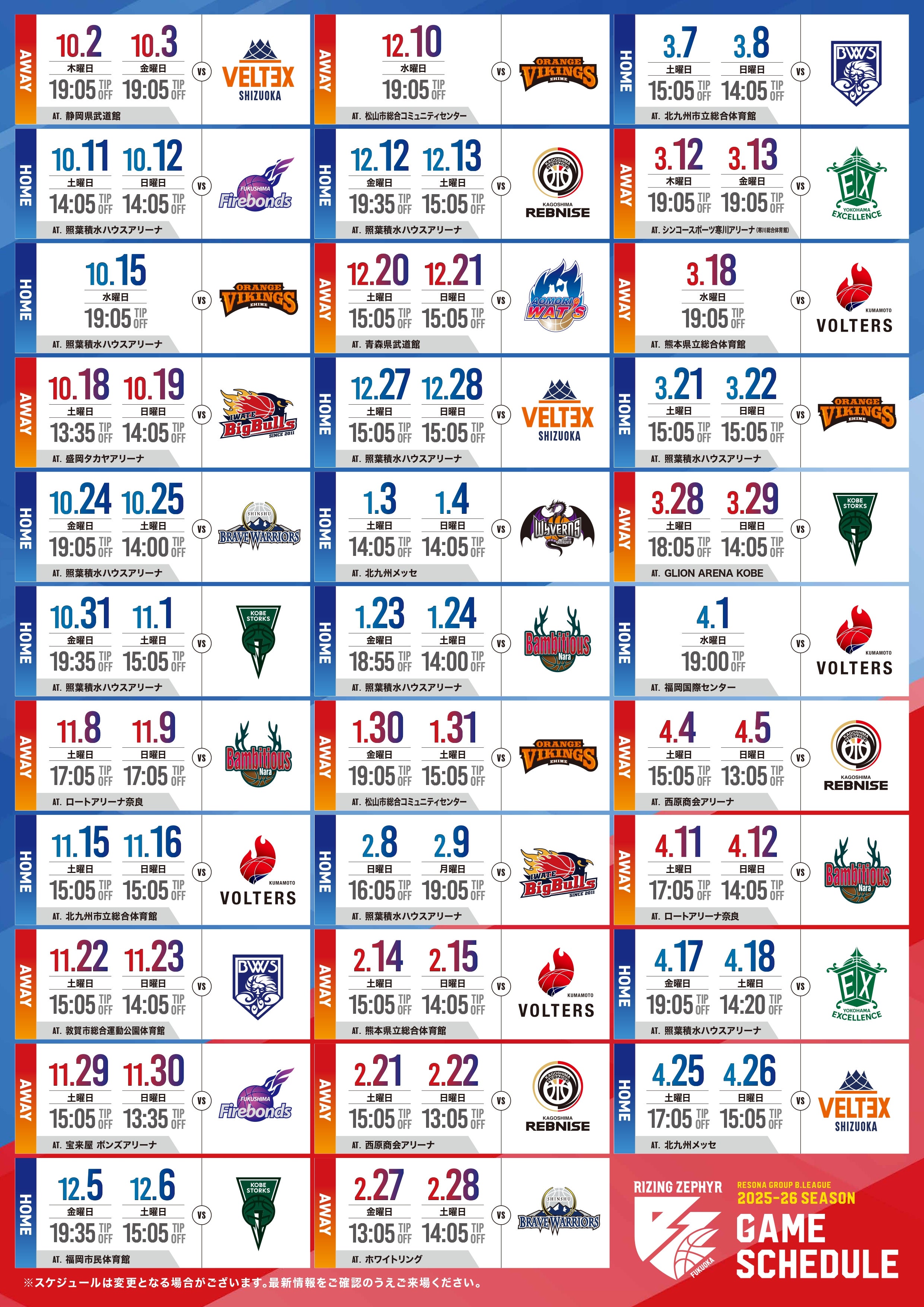 この度、2025-26シーズンの以下の試合時間および開場時間が変更となりましたのでお知らせいたします。