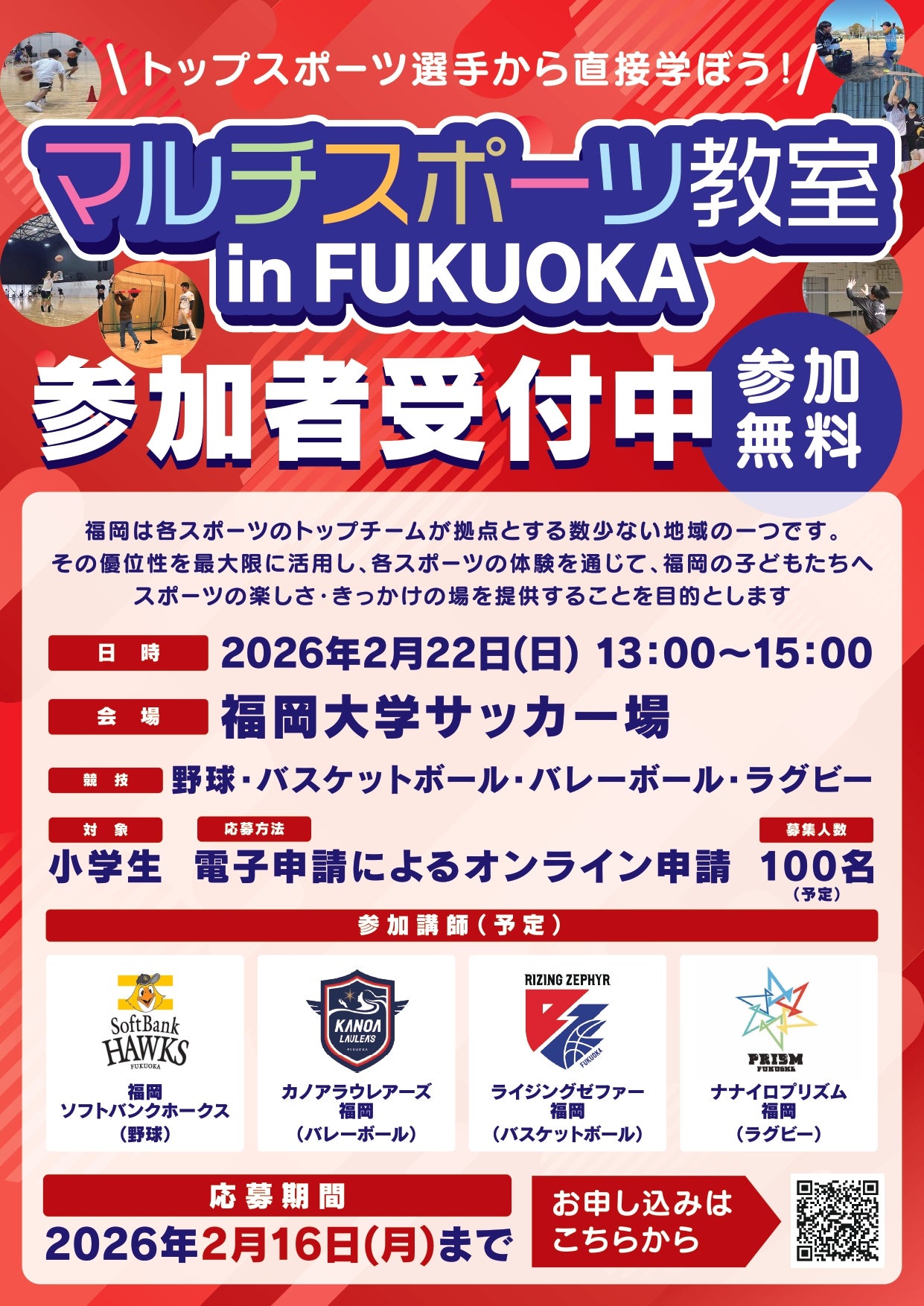 このたび、2026年2月22日(日)に福岡大学で開催される「マルチスポーツ教室 in FUKUOKA」に、ライジングゼファーフクオカが参加することとなりましたのでお知らせいたします。