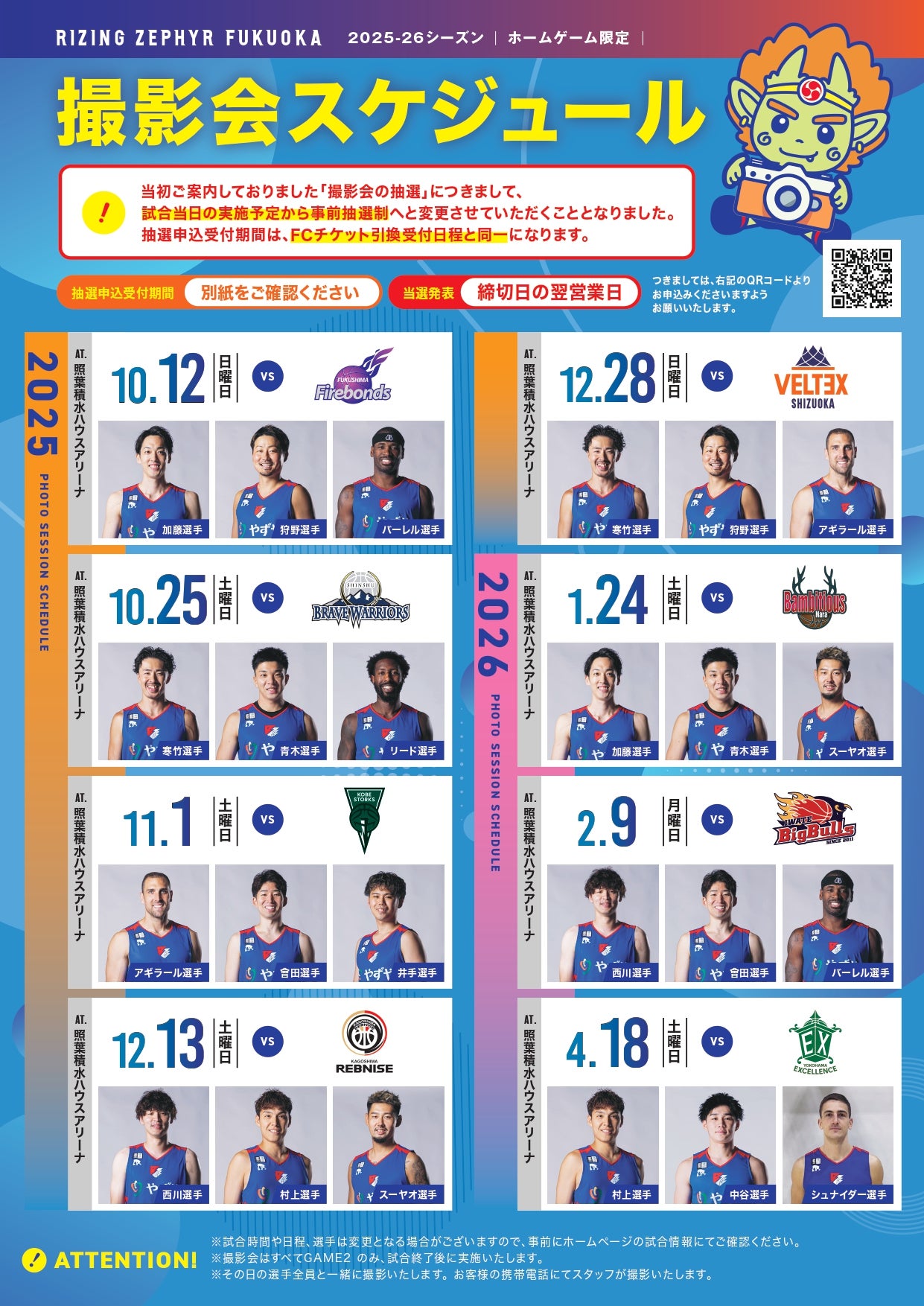 この度、りそなグループ B.LEAGUE 2025-26シーズンにおけるファンクラブ会員(プラチナ・ゴールド会員)限定「試合終了後の撮影会」について、日程決定および参加選手が一部変更となりましたのでお知らせいたします。