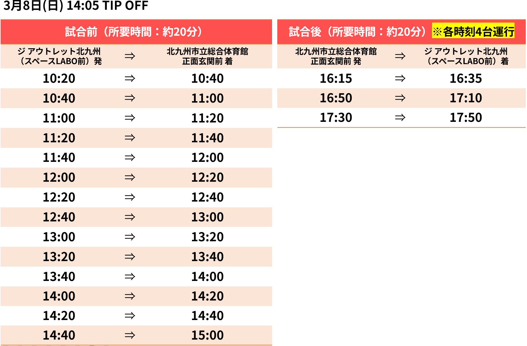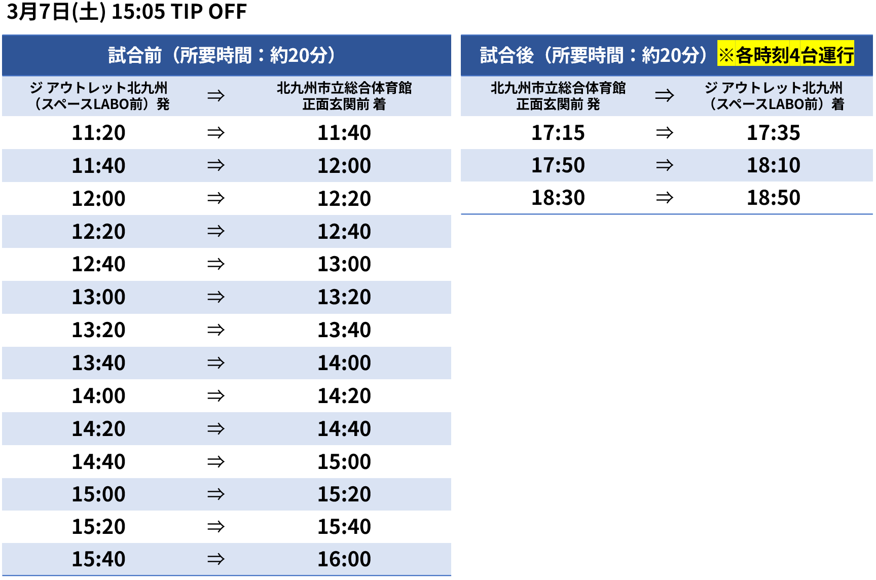 また、公共交通機関をご利用いただく方の利便性向上のため、「ジ アウトレット北九州(スペースLABO前)」と「北九市立総合体育館」を結ぶ【無料シャトルバス】を運行いたします。