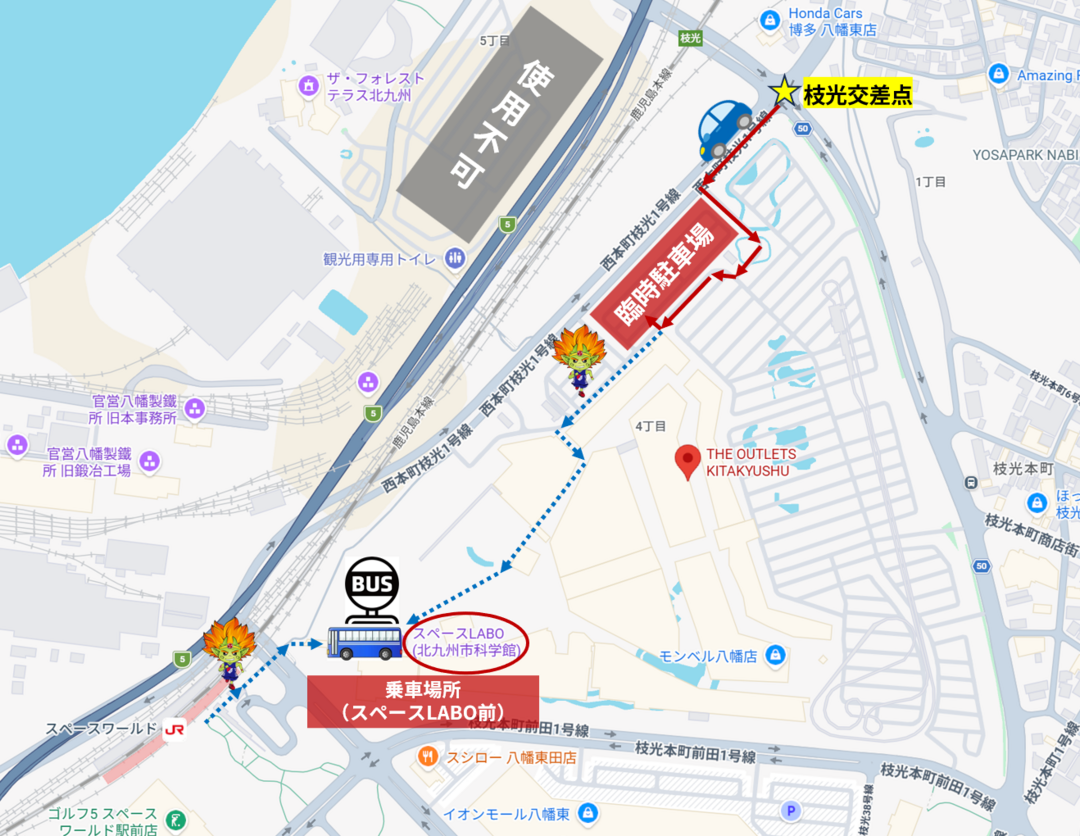 | アクセス | ■お車でお越しの方:枝光交差点をスペースワールド駅方面へ 出入口F、Gから入り 北3駐車場をご利用ください。シャトルバス乗り場まで 「ローソン」⇒「インフォメーションセンター」を越えて「スペースLABO」前までお進みください(徒歩5分) ■JRでお越しの方:「スペースワールド駅」から、「ジ アウトレット北九州」への歩道橋を渡り、「スペースLABO」前までお進みください (徒歩3分) |