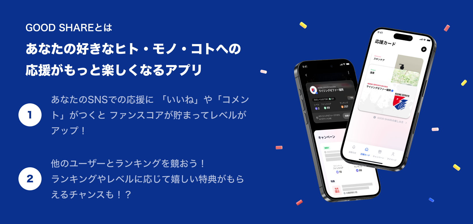 | 参加特典 | ①特別な体験型特典|対象者:キャンペーンランキング1~3位の方 ・たかいたかいダンク券(試合日に選手が抱っこしてダンクができる特典) または ・意気込みキッズインタビュー券(試合日に選手へインタビューができる特典) ※いずれかの特典を選択可能です。 ※4月18日(土)照葉積水ハウスアリーナまたは4月25日(土)北九州メッセのいずれかの日程を選択可能です。 ※キャンペーン終了後、GOOD SHAREアプリ内で当選者にご案内いたします。 ②神くんオリジナルシール|対象者:投稿された⽅全員 ※3月7日(土)福井戦~4月26日(日)静岡戦のホームゲーム会場内チケットブースにて、スタッフへGOOD SHAREアプリ内の特典画面をご提示ください。 |